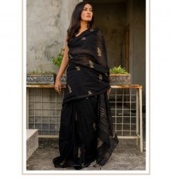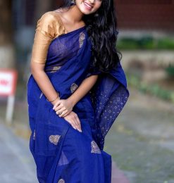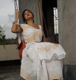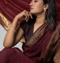 Golden-Coffee Colored Saree Texture with Golden Block Print & Yellow Block Print on The Back, Sequence Lace on The Border & Tarsals on The Back.