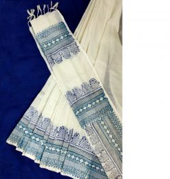 Off White Saree Texture with Block Print Design of Flowers & Leaves
