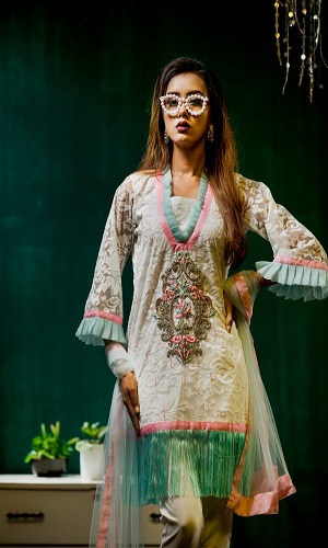 This elegant vintage styled 3 piece is a luxury outfit of the Sequin collection. This design displays a combination of pastel hues that is highly monitored and given life with perfection and detailed workmanship. Size: 36