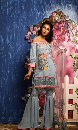 This set of kameez, pants and dupatta displays an elegant yet glamorous look.The set of 3 piece comes in a sky blue shade with beautifully crafted design to suit today’s fashion.