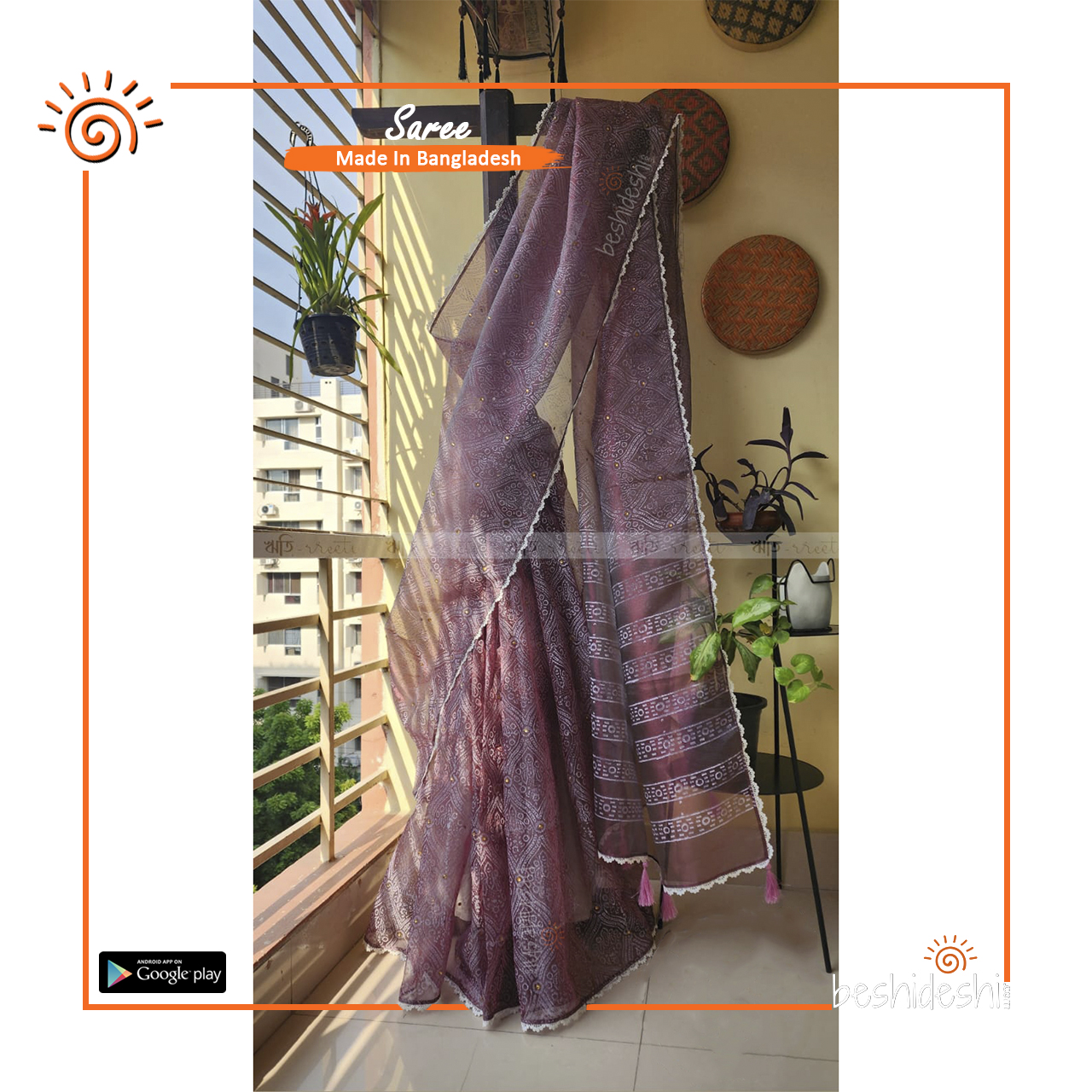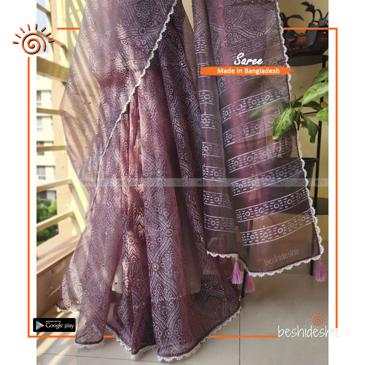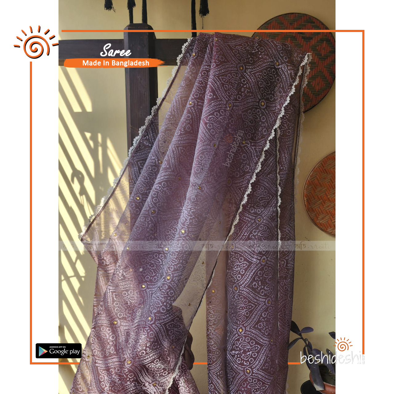 Purple Color Saree with Off White Woodblock Design & Stone Work, Lace on The Border & Silk Thread tercel on the Anchal