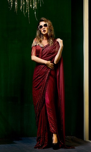 This elegant pant style Saree is from the exotic Sequin collection. This stunning Saree is in a trendy wine red color and very easy to wear. Size: 34