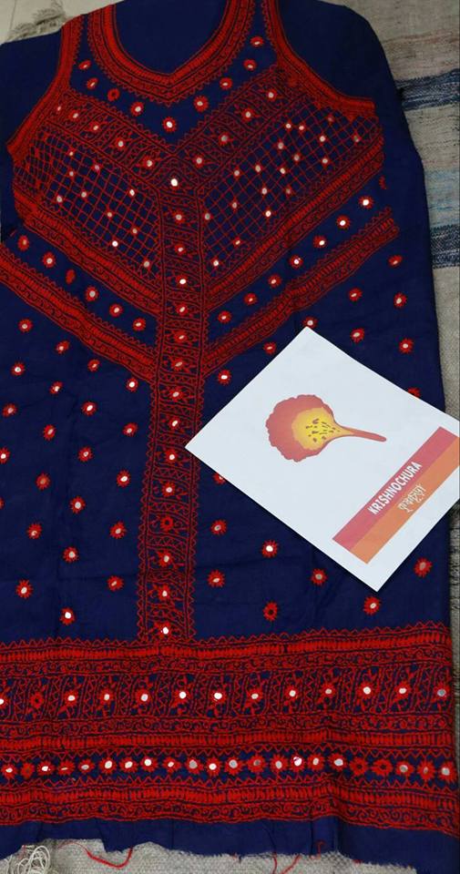 Beautifully embroidered unstitched kamiz piece in cotton voile based cloth. This piece comes in an elegant blue color and can be worn to traditional occasions such as Pooja, Eid or any other deshi festivities.