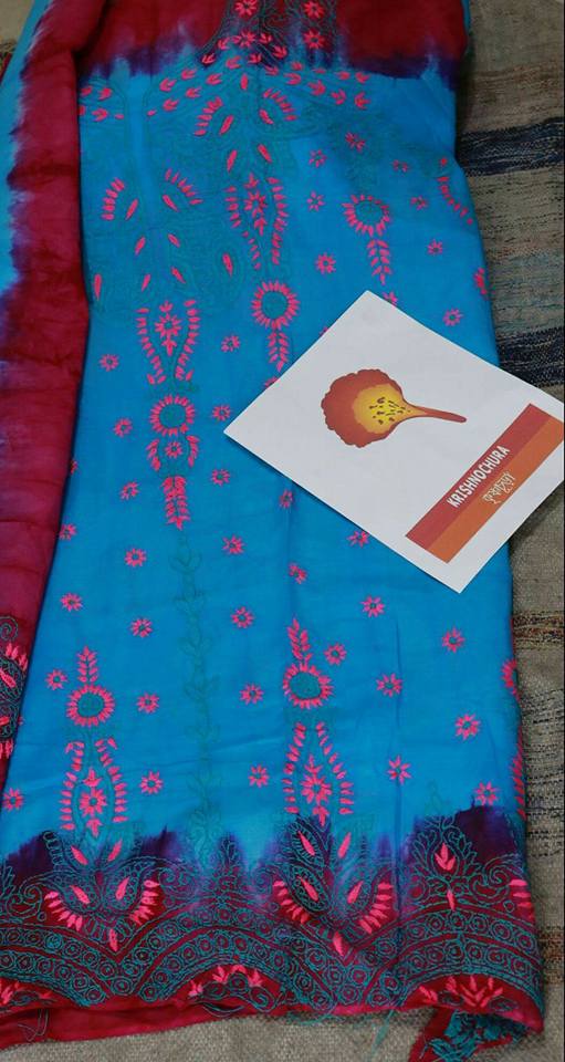 Beautifully embroidered unstitched kamiz piece in cotton voile based cloth. This piece comes in an elegant sky blue  color and can be worn to traditional occasions such as Pooja, Eid or any other deshi festivities.
