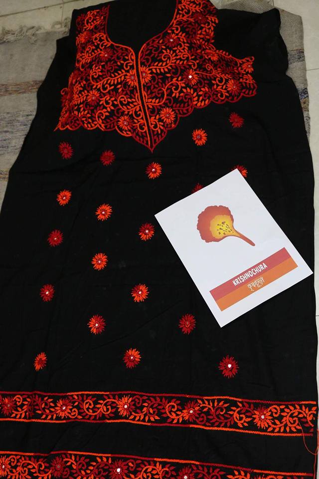 Beautifully embroidered unstitched kamiz piece in cotton voile based cloth. This piece comes in an elegant black and orange color and can be worn to traditional occasions such as Pooja, Eid or any other deshi festivities.