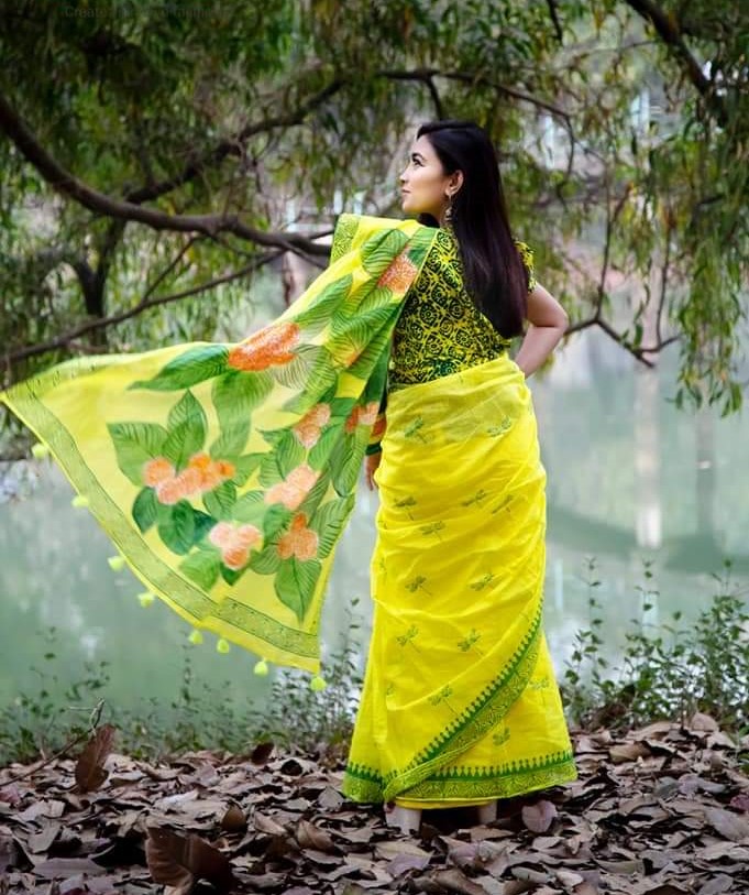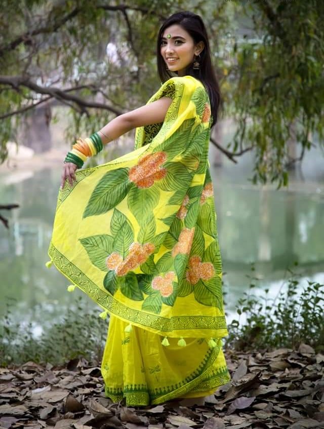 Hand painted and wooden block printed on pride cotton saree.