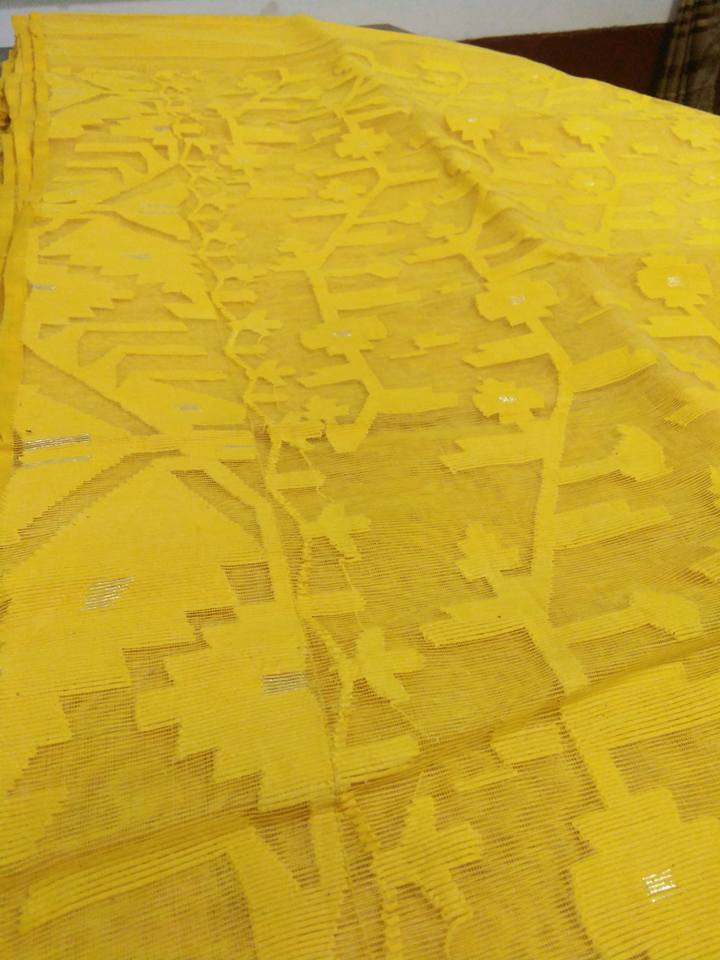 Jamdani is a hand loom woven fabric made of cotton, which historically was referred to as muslin. Jamdani weaving tradition is of Bengali origin. It is one of the most time and labor-intensive forms of hand loom weaving. This piece of elegant wear comes in a bright yellow color.