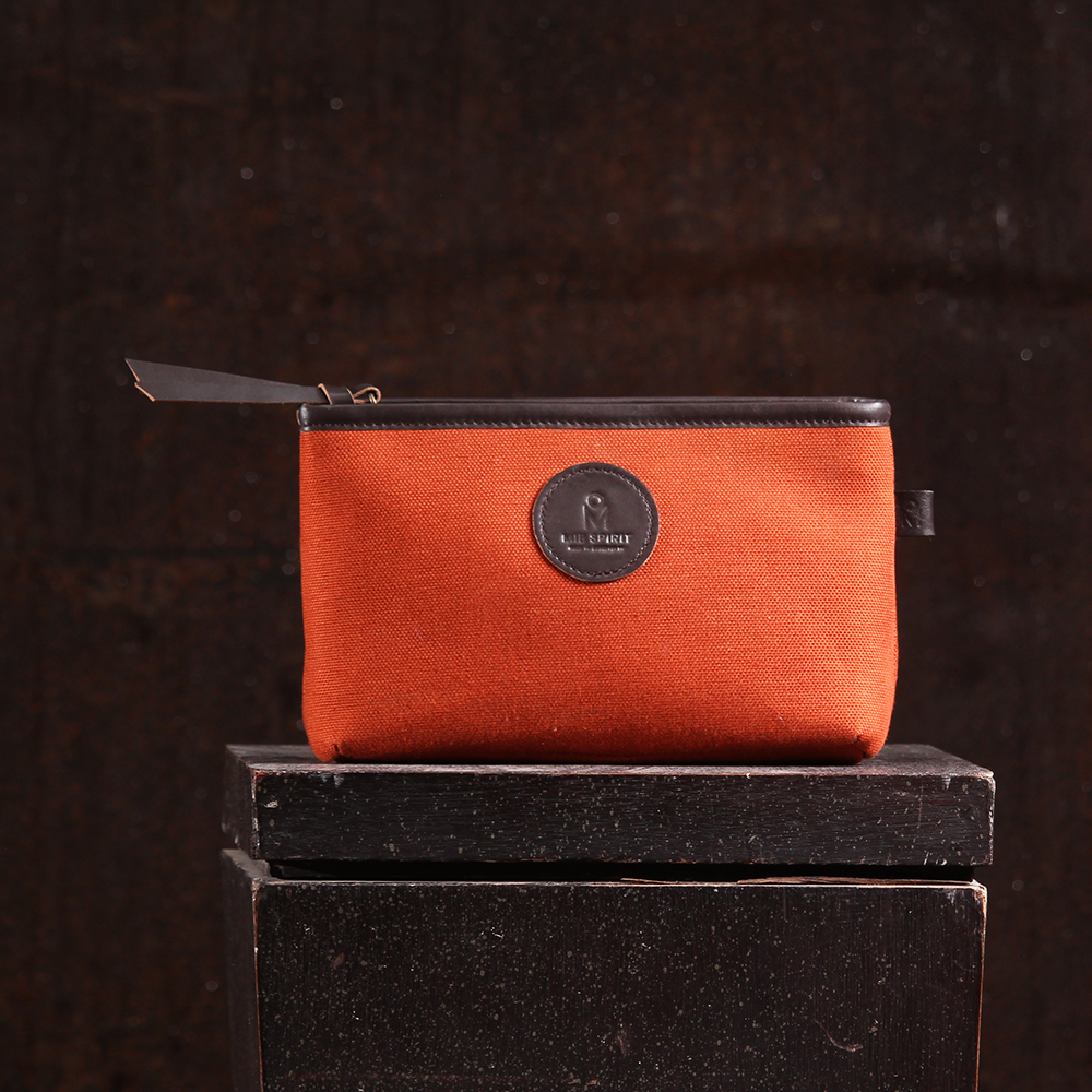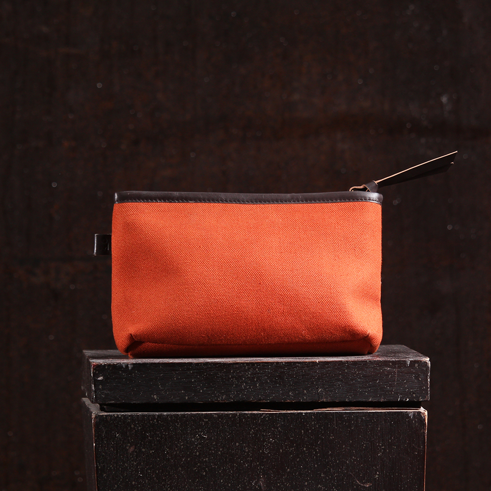 Crafted from premium Sienna colored canvas and leather, this compact accessory pouch is fastened by a secure top antique zipper. It’s ideal for organizing smaller travel essentials and cosmetic products.