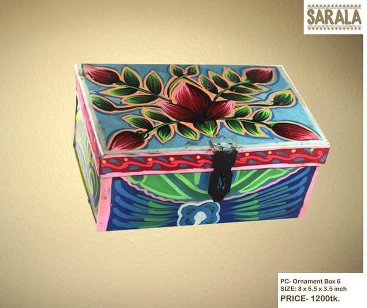 This exceptional ornament box is hand painted in a traditional Bengali style. It is a multicolored box for storage of jewelry and other accessories. It is a rectangular box with dimensions: