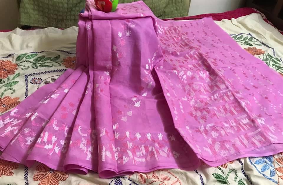 রঙঃ গোলাপী রঙের শাড়িতে ডীপ গোলাপী ও সাদা কালারের সুতার কাজ।