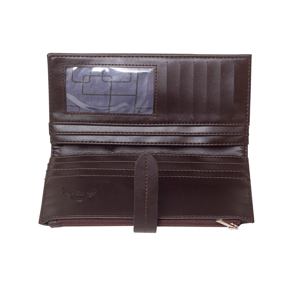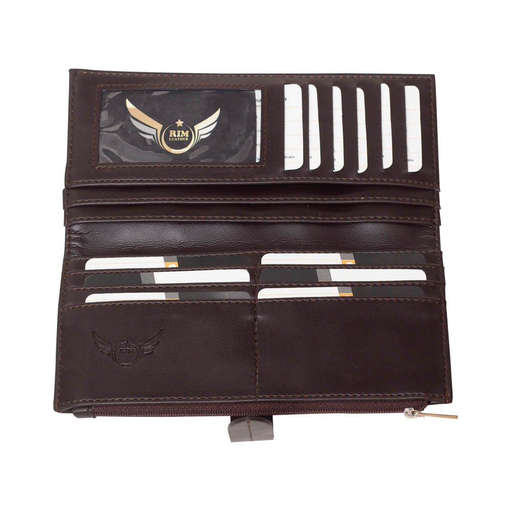 Interior details: 5 pockets for credit cards, 6 pockets for visiting card, 1 ID window, 2 large compartments for cash, 1 additional pocket for receipts, 1 zipped coin pocket.