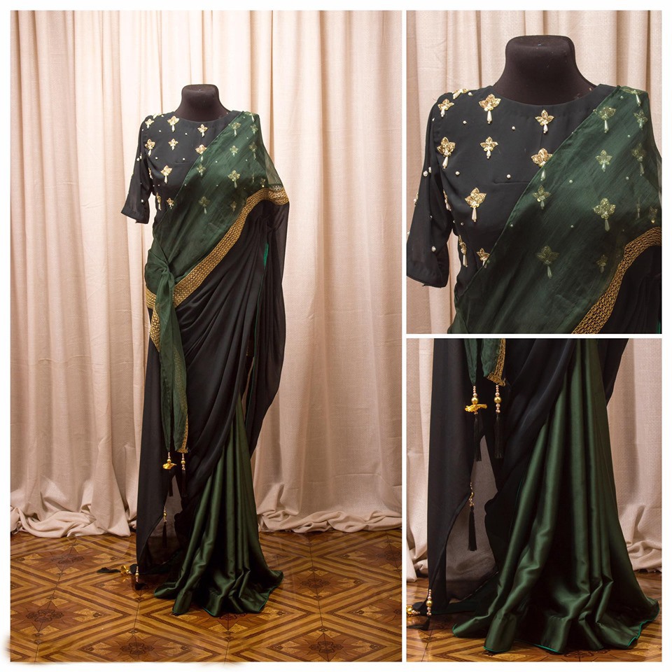 Bottle green saree with contemporary style zardosi work blouse made with the technique of Pitta Nokshi ~an intricate hand embroidery karchupi work.