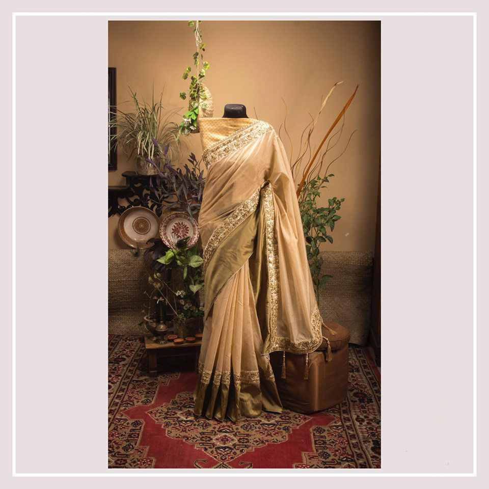 Ivory gold chunri kota saree enhanced with white gorgeous paar and pairs with a gold benaroshi blouse piece.