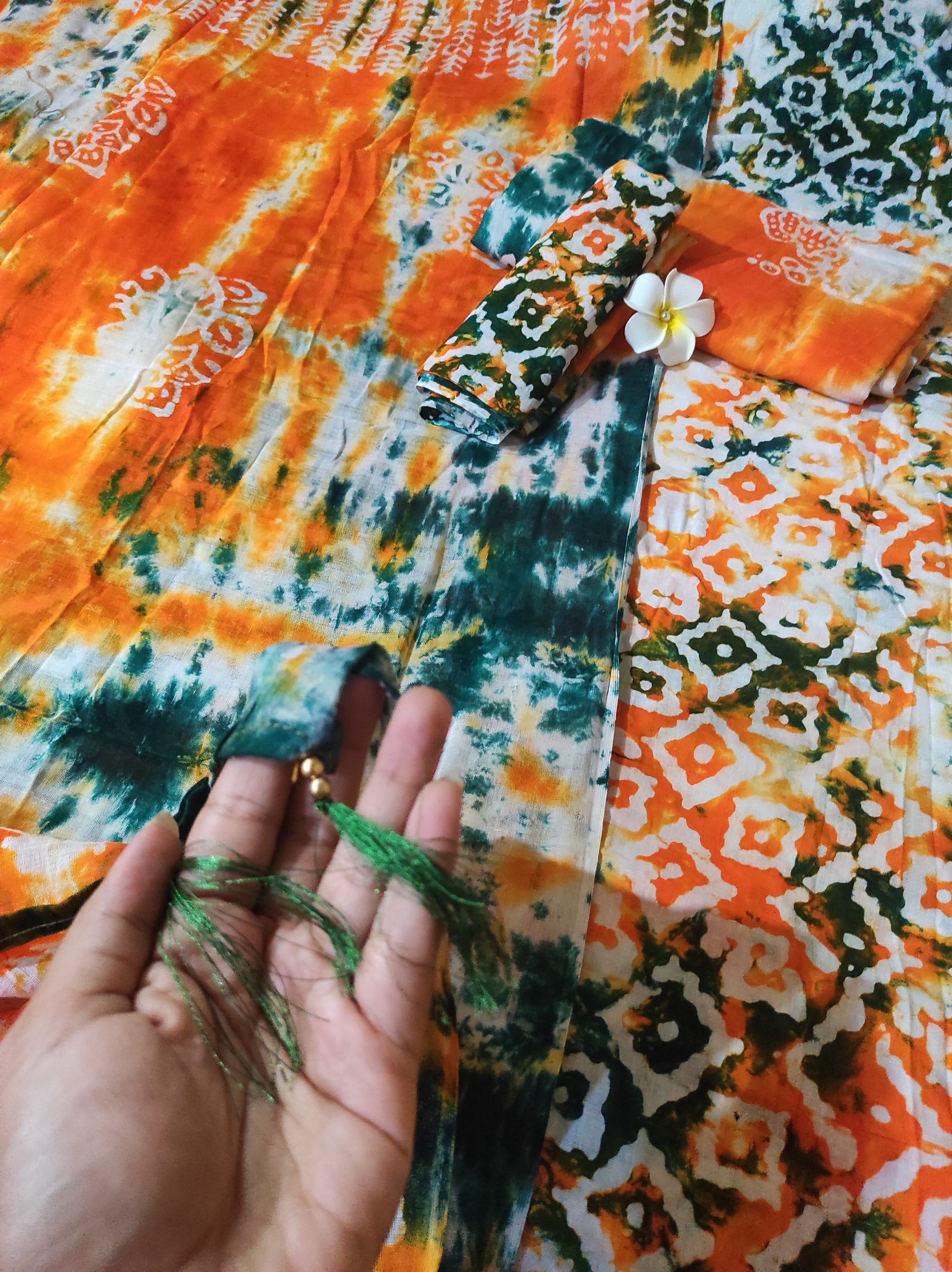Description: Batik on voile cloth. Combinations of orange, green and white. A dress that is much more colorful.
