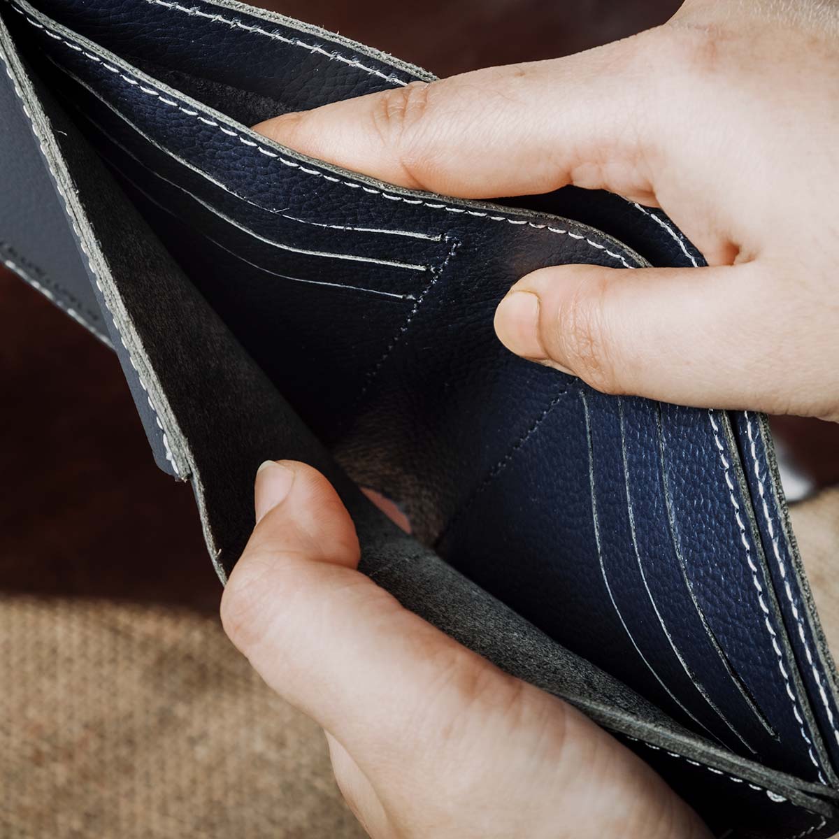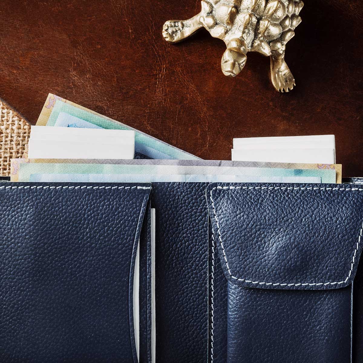 Description: With too many kinds of notes it often becomes haphazard to find the right note at the right time. So we are offering you the Wallet BD1 with two separate cash chambers where you can assort the notes in any order you need, and also can keep your cards safe in six hidden card slots and two extra vertical card slots in front. Your coins won’t run from your wallet, they will be safe in their own chamber in fold.