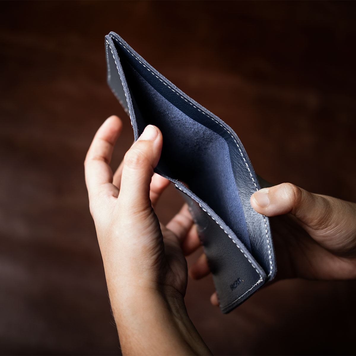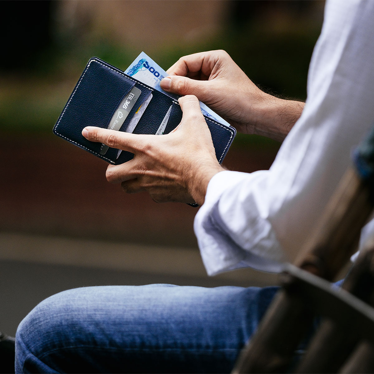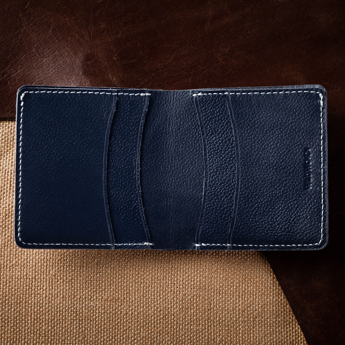 This minimal wallet features one internal cash chamber and four separate card slots in the front.